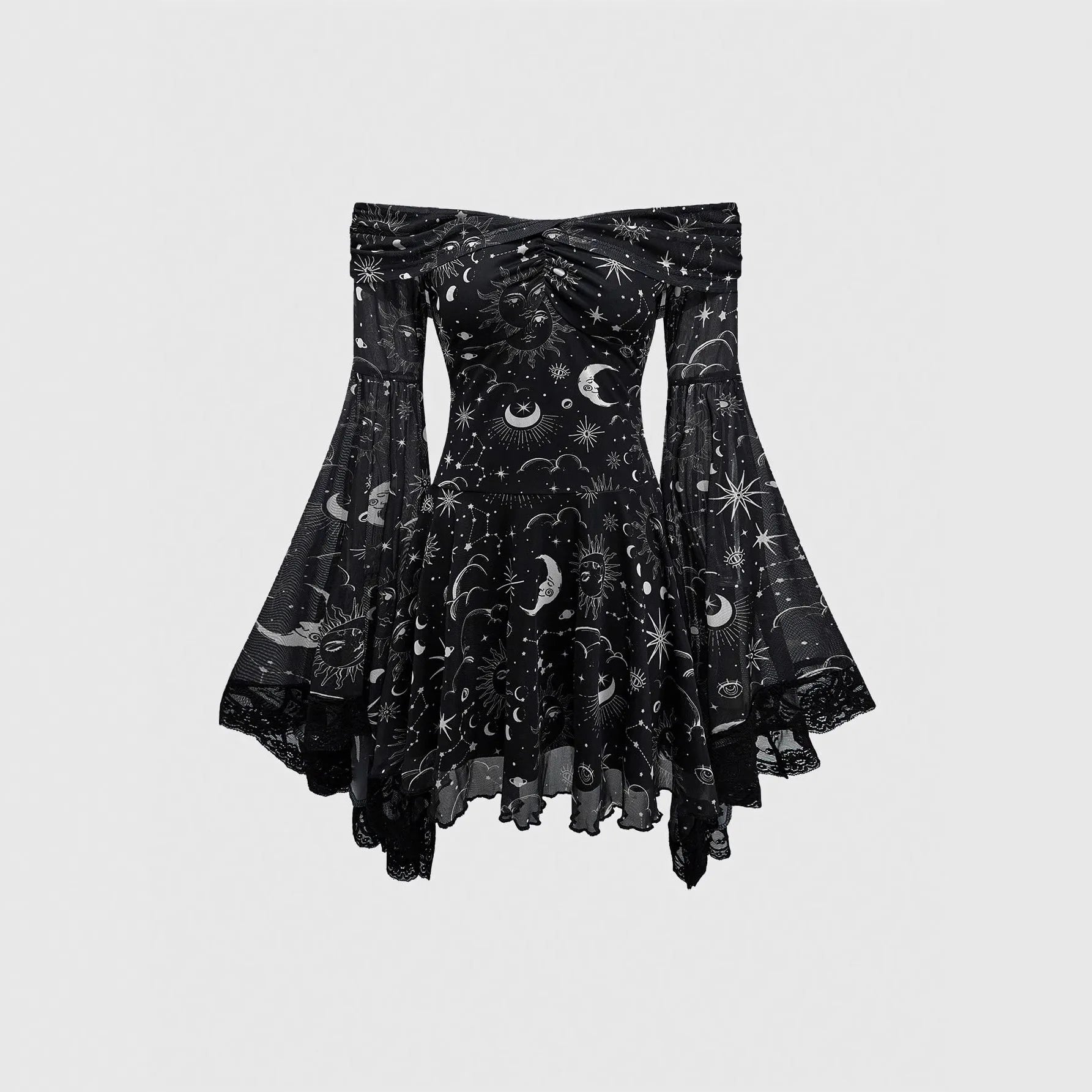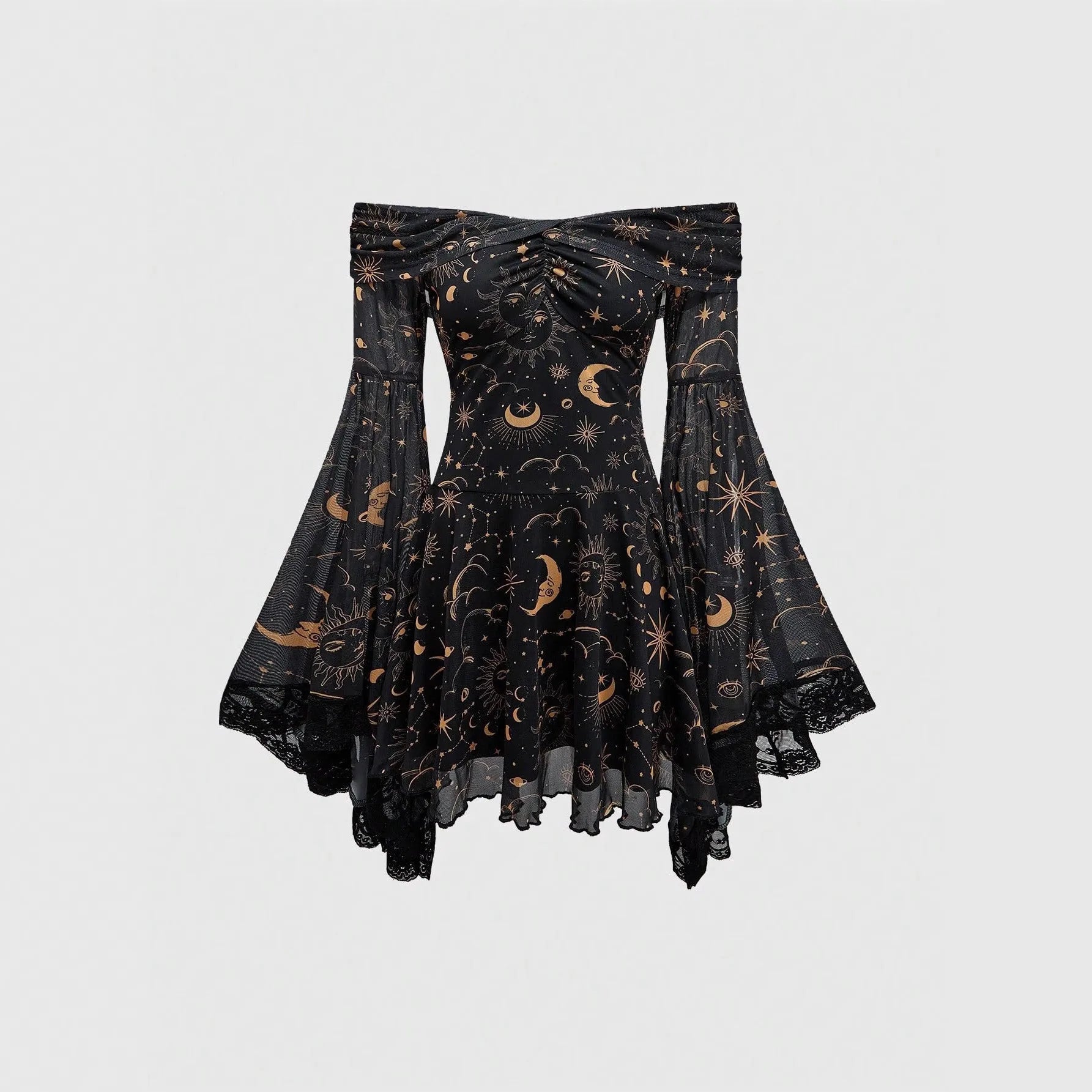 Gothic Style Vintage Star Moon Long Sleeve A- Line Dress