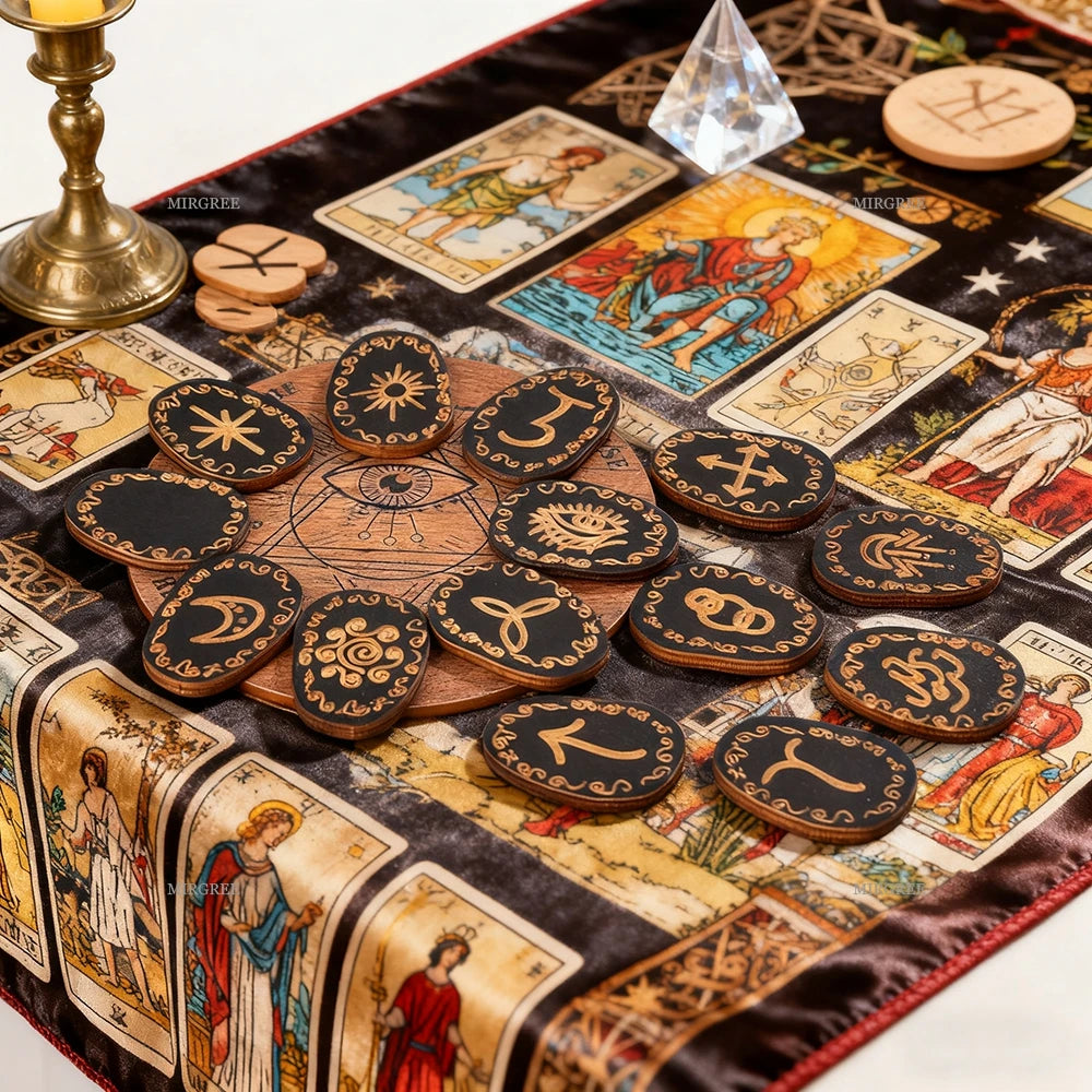 Perfect for those drawn to witchy home decor and the bohemian lifestyle, this set invites you to explore guidance, meditation, and reflection through rich symbolism rooted in witchcraft and tarot traditions. The unique runes, showcasing iconic motifs like the Eye of Sight and celestial signs, resonate with gothic and witchcore aesthetics, making this set both a powerful oracle and a striking artisanal treasure.