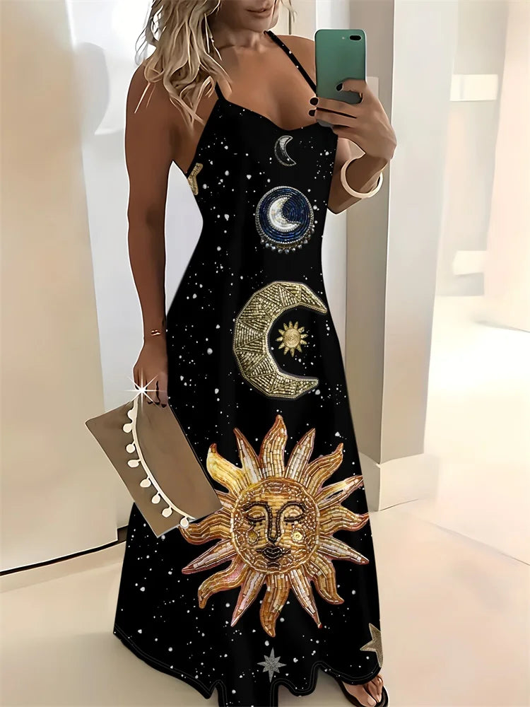 Step into a realm where effortless comfort meets captivating style. This ankle-length halter dress, crafted from a soft, slightly stretchy polyester blend, drapes loosely to flatter your natural silhouette while allowing free movement—perfect for spirited evenings or mystical daytime wanderings.