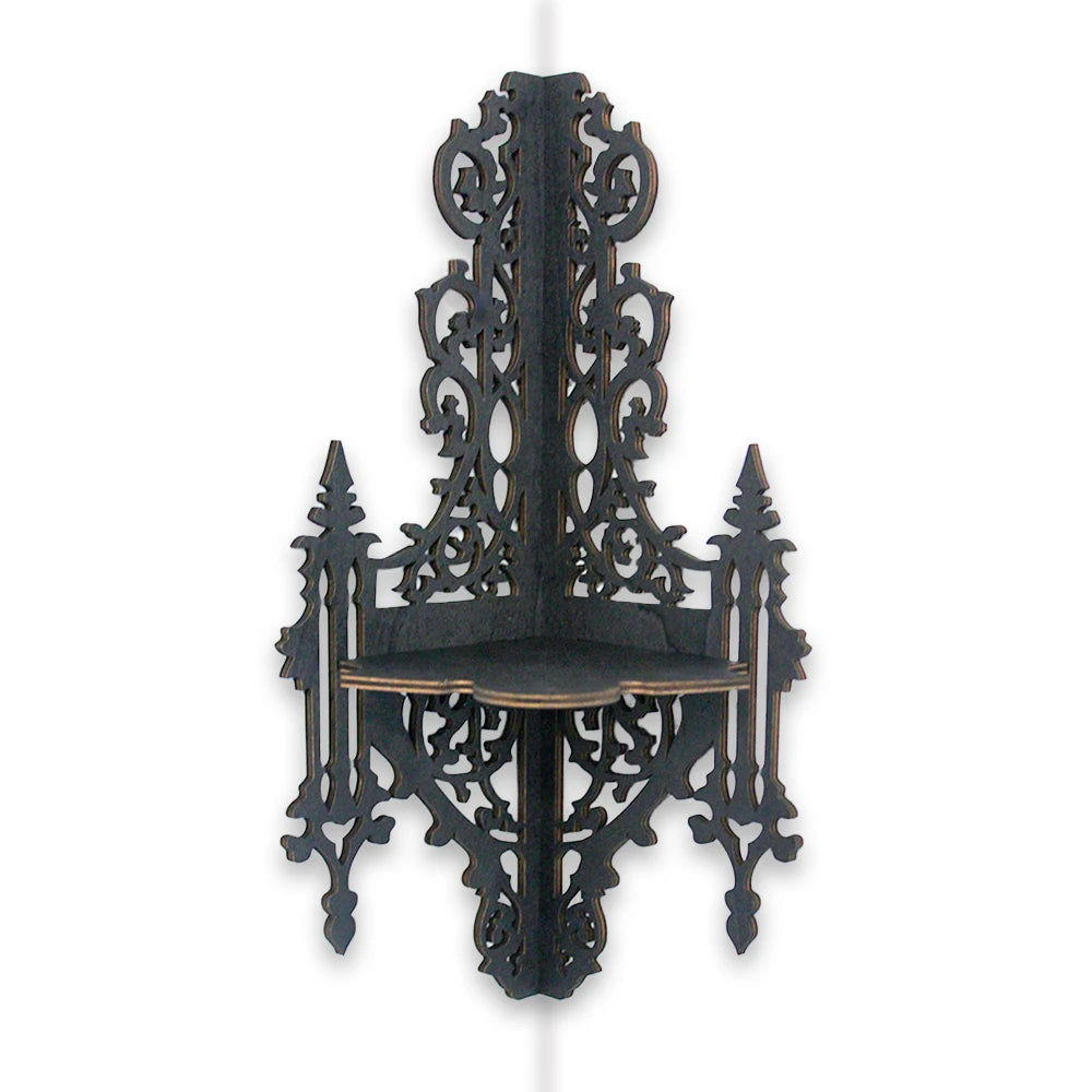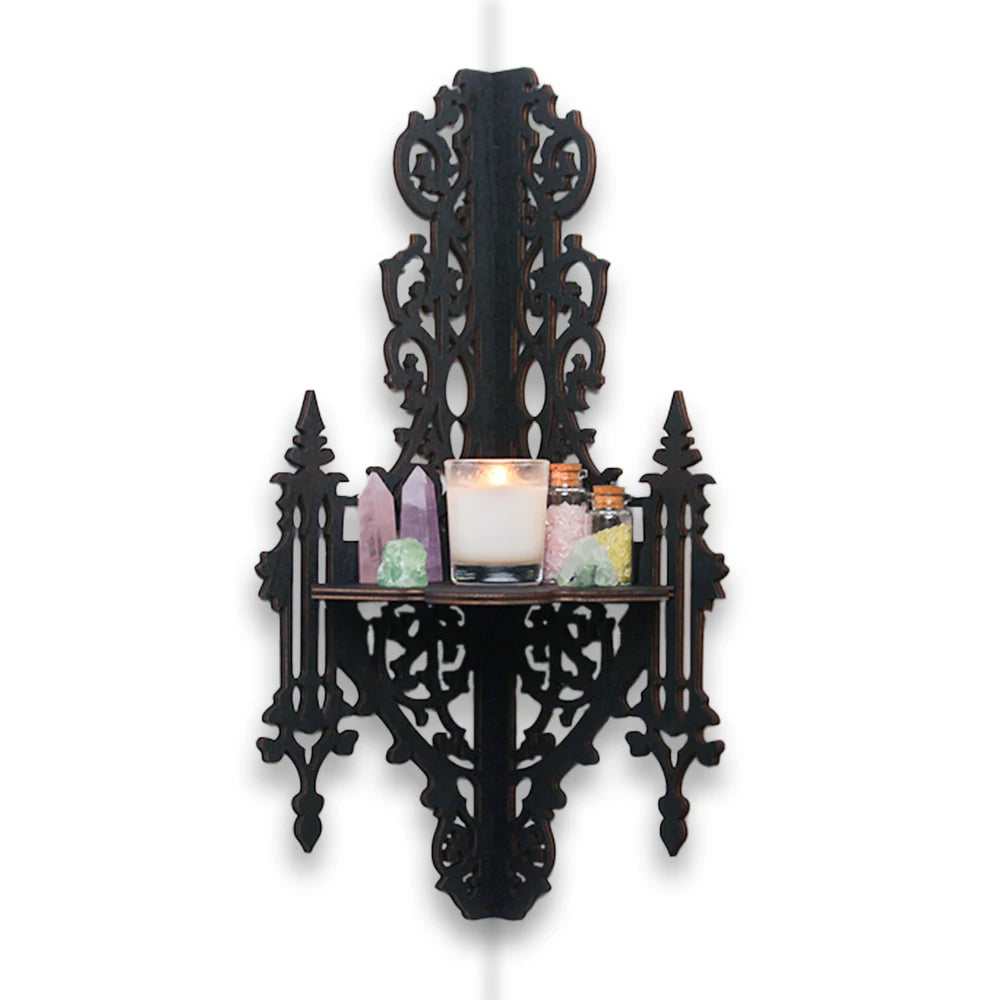 Transform your bedroom or hallway into a sanctuary of enchanted living with this Gothic Wooden Floating Shelf by Witchy Way Wares. Crafted from durable, eco-friendly wood, this wall-mounted corner shelf blends gothic mystique with practical design, offering a stable and stylish display for your beloved plants, candles, crystals, or spiritual artifacts.