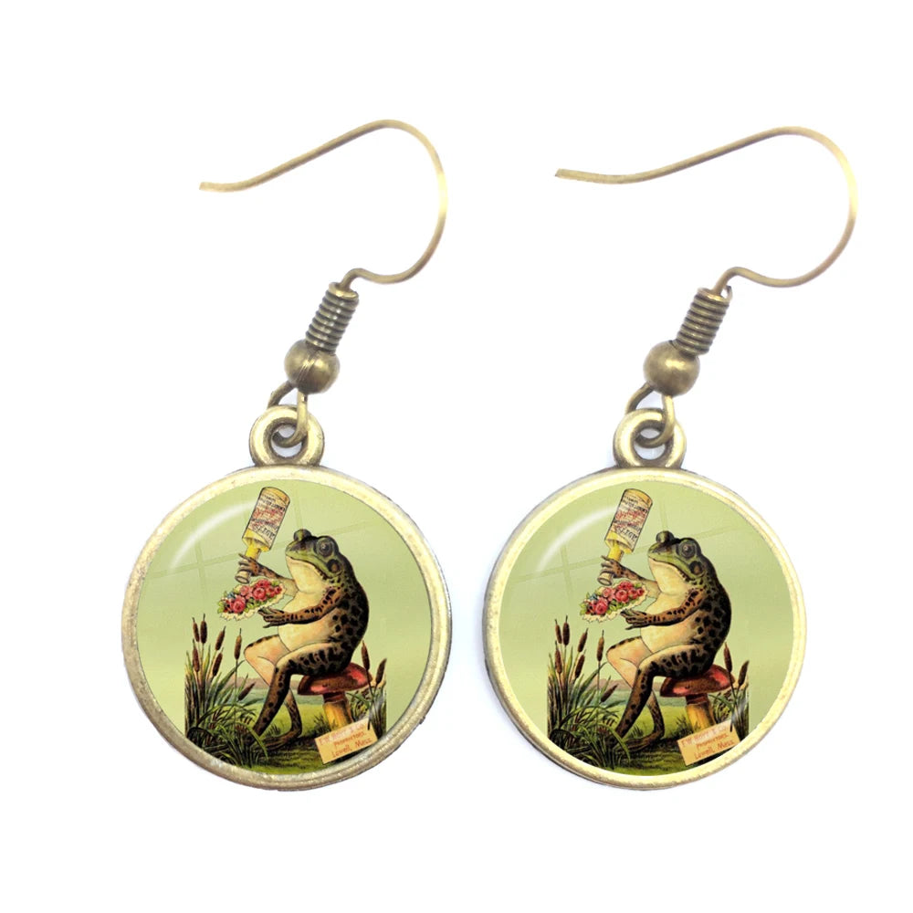 Embrace the magic of nature and fairy tales with our Frog Fairy Tale Drop Earrings from Witchy Way Wares. Handcrafted to capture the playful spirit of woodland lore, each earring features a 16mm glass cabochon showcasing a vibrant frog design that invites whimsy and wonder into your everyday look.