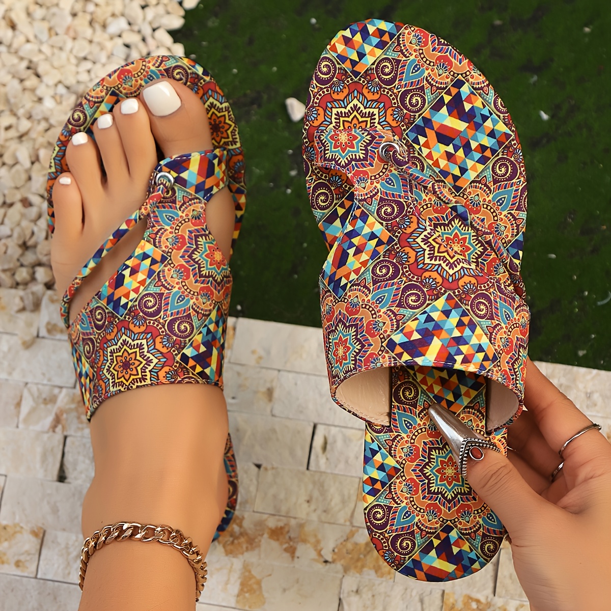 Step into effortless bohemian style with these slip-on flip-flops, showcasing vibrant mandala patterning across a soft fabric upper. The flat heel design and open-toe silhouette prioritize comfort for warm-weather exploration, while the durable PU sole ensures reliable traction and longevity. Crafted from quality man-made materials with a fabric insole, these versatile sandals transition seamlessly from beach outings to casual everyday wear. Hand-washable for easy maintenance, they embody relaxed sophistication—ideal for those seeking accessible luxury in their seasonal wardrobe. Perfect for vacation getaways or year-round comfort-focused dressing.